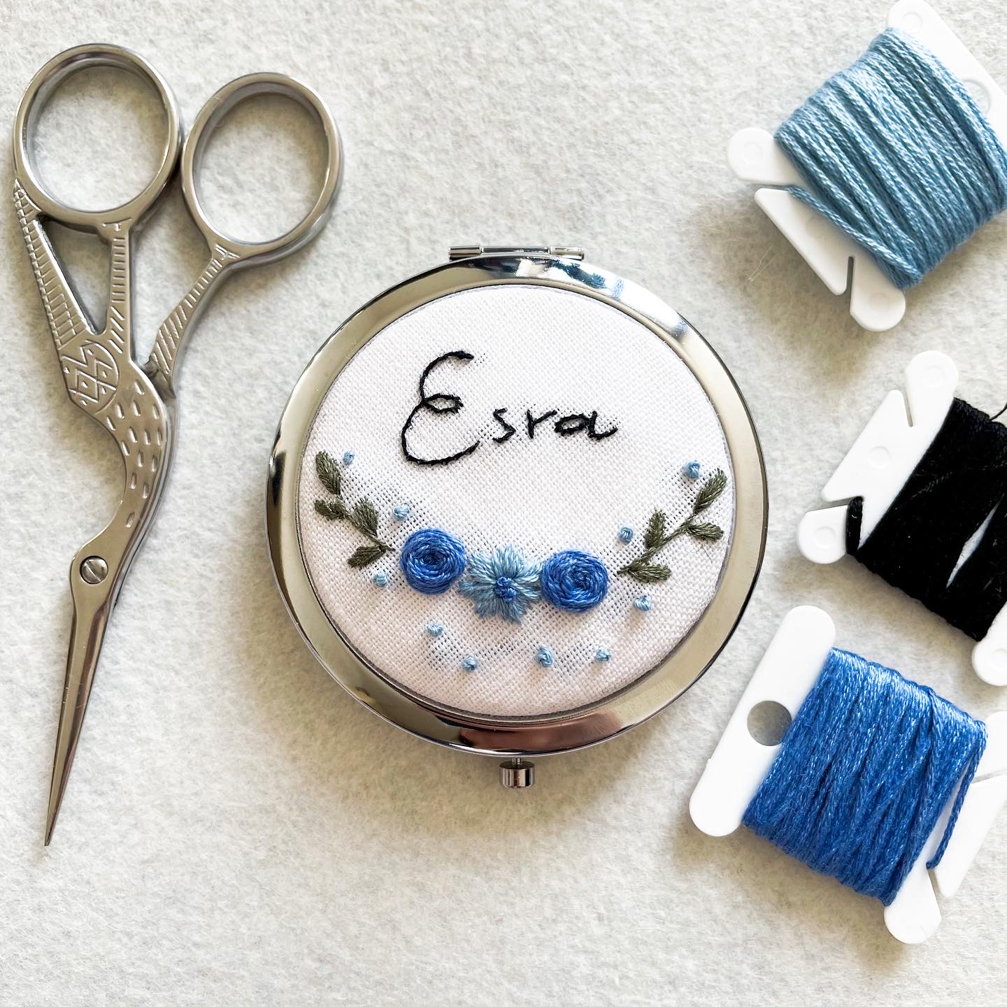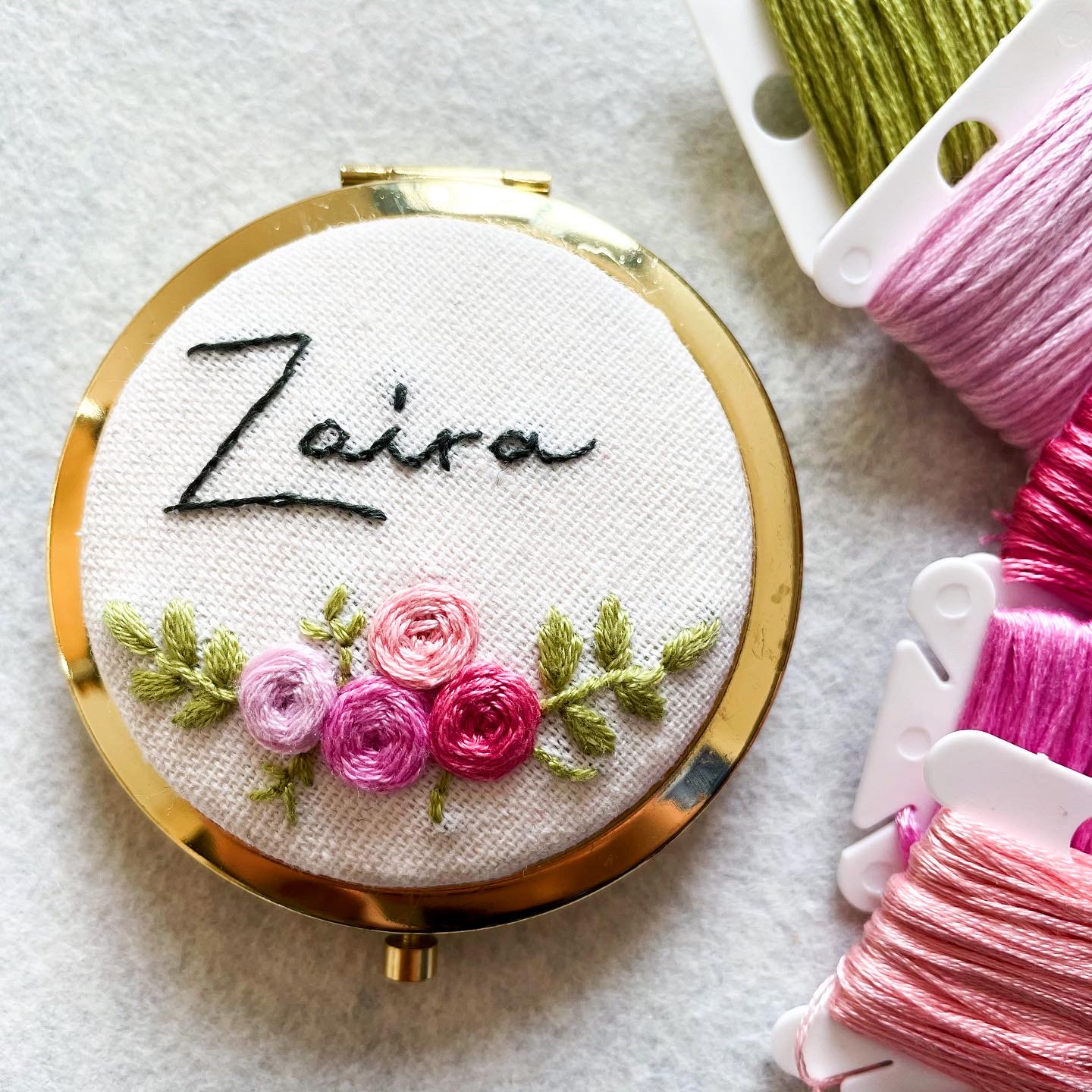 Eleganter Handspiegel mit besticktem Rahmen – ein luxuriöses Accessoire für jeden Tag.
